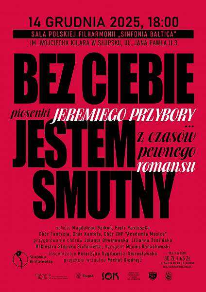 Serdecznie zapraszamy na pełen wzruszeń koncert poświęcony romansowi Jeremiego Przybory i Agnieszki Osieckiej. W programie znajdą się zarówno piosenki do tekstów będących wyrazem miłości dwojga poetów, jak i fragmenty korespondencji i wspomnień. Solistami będą Magdalena Dzikoń i Piotr Pastuszka, których głosy przeniosą Państwa w świat poezji. Wystąpią również chóry - Fantazja przygotowany przez Liliannę Zdolińską oraz Kantele i ZNP "Academia Musica" przygotowane przez Jolantę Otwinowską. Autorem projekcji wizualnej jest Michał Giedrojć, a za inscenizację odpowiada Katarzyna Sygitowicz - Sierosławska. Orkiestrę poprowadzi autor wszystkich aranżacji - Maciej Banachowski.