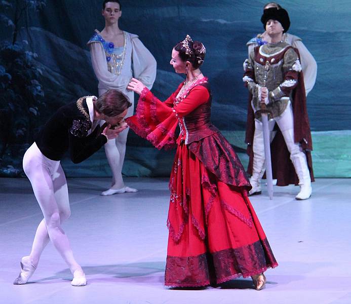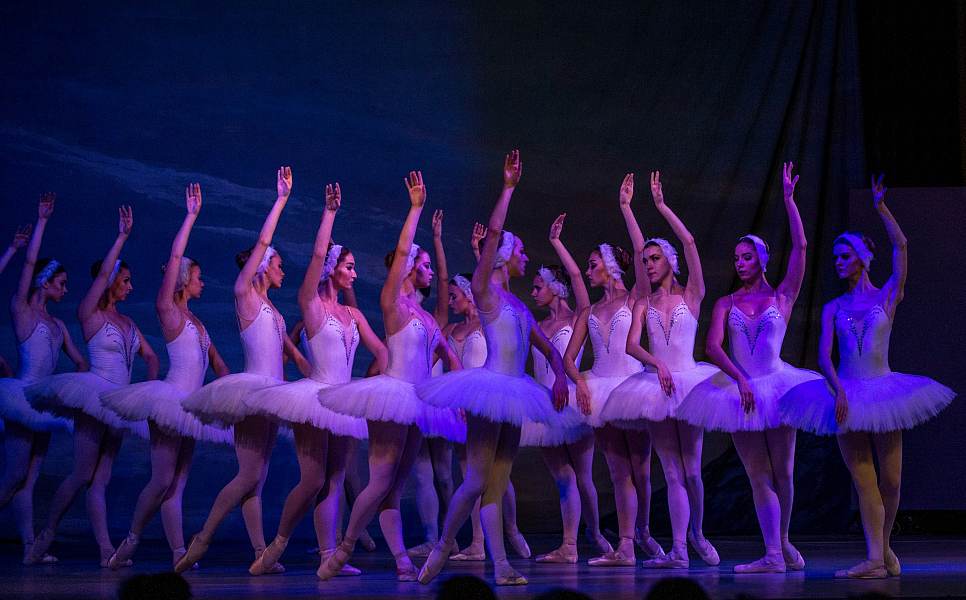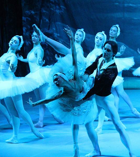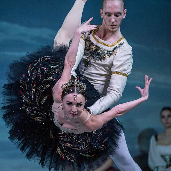 Dawno temu, za siedmioma górami , za siedmioma rzekami... Tak zaczyna się nie jedna bajka i legenda o zaklętych osobach w zwierzęta .Najpiękniejsza to piękna i bestia, tylko wielkie uczucie tytułowej Pięknej potrafiło pokonać zaklęcie i zdjąć czary z Bestii. Temat baletu zaczerpnięty jest z różnych legend o dziewczynie zaklętej w ptaka, występujących w mitologii greckiej i folklorze baśniowym wielu krajów Europy i Wschodu. Akcja rozgrywa się w nieokreślonej epoce, w jakimś zakątku Europy. - Z okazji dnia pełnoletności księcia Zygfryda odbywa się festyn, młodzież wiejska bawi się i tańczy w obecności dworu. Księżna oznajmia synowi , że jutro będzie musiał wybrać narzeczoną spośród przedstawionych mu na balu panien. Zygfryda martwi decyzja matki. By oderwać go od smutnych myśli, przyjaciele proponują wyprawę na polowanie. W dali widać stadko przylatujących łabędzi. - Skalisty brzeg jeziora. Zjawia się stado łabędzi z królową na czele. Przyjaciel księcia Benno z towarzyszami celują z łuku do ptaków. Przybiega Zygfryd, przymierza się do strzału, gdy nagle staje przed nim królowa Odetta. Oczarowany jej pięknością książe nie pozwala strzelać do ptaków i odprawia myśliwych. Ze wszystkich stron otaczają go białe łabędzie, Odetta wyjaśnia księciu ich tajemnicę: zły czarownik Rotbard zamienił ją i jej towarzyszki w łabędzie, które tylko o północy nad brzegiem jeziora mogą przybierać ludzką postać. Zaklęcie to może jedynie złamać szczere uczucie człowieka, który nigdy jeszcze nie wyznał nikomu miłości. Wśród skał ukazuje się złowrogi ptak; to Rotbard, który przypomina Odetcie o swojej władzy nad nią, a księciu o grożącym mu niebezpieczeństwie. Lecz młodzieniec nie lęka się pogróżek. Ulegając czarowi Odetty, przysięga jej wieczną miłość i wyzwolenie. Zbliża się świt, łabędzie muszą odejść. - Sala balowa na zamku księżnej. Schodzą się goście, witani przez mistrza ceremonii, za nimi wkracza z synem księżna i sześć młodych panien, z których Zygfryd ma dziś wybrać narzeczoną. Jednakże żadna z nich nie podoba się młodemu księciu; zatopiony w marzeniach, myśli wciąż o tajemniczej dziewczynie - łabędziu. Nagle fanfary oznajmiają przybycie niespodziewanych gości. To Rotbart w ludzkiej postaci ze swą córką, piękną Odylią, której łudzące podobieństwo do Odetty oszałamia Zygfryda. Rozpoczyna się bal. Rotbard nakazuje córce, by postarała się zdobyć słowo księcia, gdy bowiem zakochany młodzieniec zapomni o Odetcie i wyzna miłość innej, złamie przysięgę wierności. Tak też się dzieje - w oknie ukazuje się przelotna wizja zrozpaczonej Odetty i Zygfryd pojmuje, że padł ofiarą podstępu. Zwycięski Rotbart wyprowadza córkę, a Zygfryd w rozpaczy opuszcza zamek. - Nad brzegiem jeziora łabędzie z niepokojem oczekują powrotu królowej. Odetta wraca smutna opowiada towarzyszką o zdradzie Zygfryda. Lecz oto zjawia się książę, pełen skruchy i żalu, zapewnia Odettę o swej miłości; przecież to ją widział w osobie Odylli. W ten z łopotm skrzydeł - wśród błyskawic i huku piorunów nadlatuje czarny ptak - Rotbart. Nie mogąc pokonać uczucia kochanków, grozi księciu śmiercią, lecz Zygfryd nie chce ratować się ucieczką, gotów umrzeć razem z Odettą. Oboje giną w falach jeziora. Zwyciężony potęgą miłości Rotbart pada martwy. - Zakończenie może być tylko jedno - w złotej łódce, ciągnionej przez białe łabędzie, Odetta i Zygfryd płyną do krainy wiecznej szczęśliwości.
