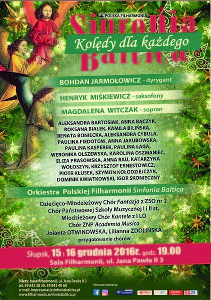 Program ostatniego w tym roku koncertu orkiestry Polskiej Filharmonii Sinfonia Baltica złożony jest z pięknych, tradycyjnych polskich kolęd. Będą także kolędy współczesne i piosenki zimowe oraz wspólne śpiewanie. Słupscy wykonawcy, 15 i 16 grudnia 2016 r. zaśpiewają tylko po jednej piosence. Najważniejsi soliści to Henryk Miśkiewicz i Magdalena Witczak.