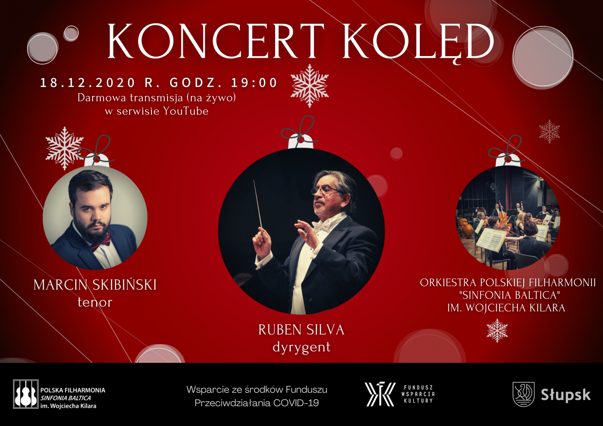 Już dziś zapraszamy Państwa na wyjątkowe wydarzenie organizowane przez Polską Filharmonię „Sinfonia Baltica” im. Wojciecha Kilara. W piątkowy wieczór 18.12.2020 r. o godz. 19:00 zagramy dla Państwa koncert kolęd, który transmitowany będzie na żywo z estrady Filharmonii na naszym kanale YouTube. W programie koncertu znajdą się tradycyjne polskie kolędy oraz utwory świąteczne znane m.in. z radia. U boku Maestro Rubena Silvy oraz Orkiestry Polskiej Filharmonii „Sinfonia Baltica” im. Wojciecha Kilara wystąpi tenor Marcin Skibiński. Koncert poprowadzi niezastąpiony Andrzej Zborowski.