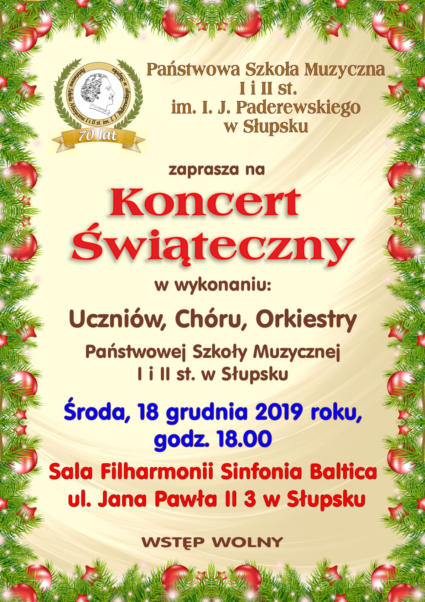 Państwowa Szkoła Muzyczna I i II stopnia im. Ignacego Jana Paderewskiego w Słupsku zaprasza serdecznie na "Koncert Świąteczny" w wykonaniu Uczniów, Chóru i Orkiestry w Środę 18 grudnia 2019 roku o godzinie 18:00 Koncert odbędzie się w sali Polskiej Filharmonii Sinfonia Baltica im. Wojciecha Kilara w Słupsku.