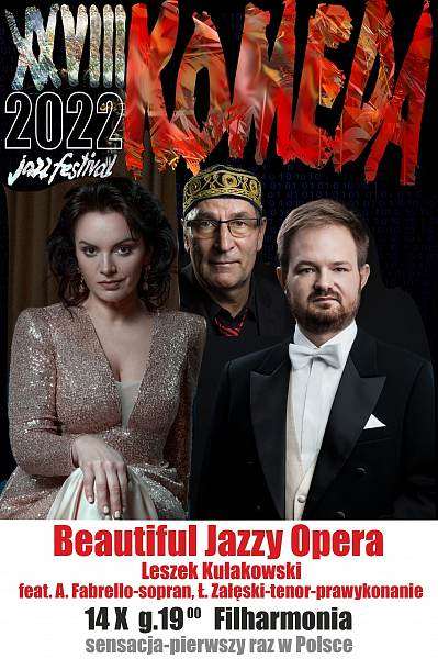 Zaprezentujemy premierowy projekt, syntetyzujący klasyczną operę z elementami jazzu - nasyconą harmoniką, intensywnym rytmem, motoryką, improwizacją. Projekt pt. ”Leszek Kułakowski Beautiful Jazzy Opera” traktuje arie operowe zgodnie z oryginałem, a stosunku jeden do jednego. Plan harmoniczny towarzyszący ariom jest wzbogacony, nasycony bogatą harmoniką i oryginalną aranżacją Leszka Kułakowskiego. Aranżacje Kułakowskiego dodają nowych kolorów, nie burząc dominującego charakteru poszczególnych arii, delikatnie dodają wysublimowanych szczegółów w fakturze aranżacyjnej. Arie są pretekstem do lekkich, improwizacyjnych wędrówek jazzmanów. Projekt adresowany do fanów zarówno klasycznej opery, jak i publiczności szukającej „świeżych”, muzycznych emocji. Solistami są wybitni śpiewacy operowi Anna Fabrello - sopran i Łukasz Załęski - tenor. Całość oparta o solidną jazzującą sekcję rytmiczną złożoną w wybitnych polskich jazzmanów: Leszka Kułakowskiego - aranżacje, fortepian, Tomasz Sowińskiego - perkusja, Adama Żuchowskiego - kontrabas. Projekt absolutnie oryginalny, unikatowy, cross-over. Koncert live będzie nagrywany na płytę CD dla wytwórni ForTune
