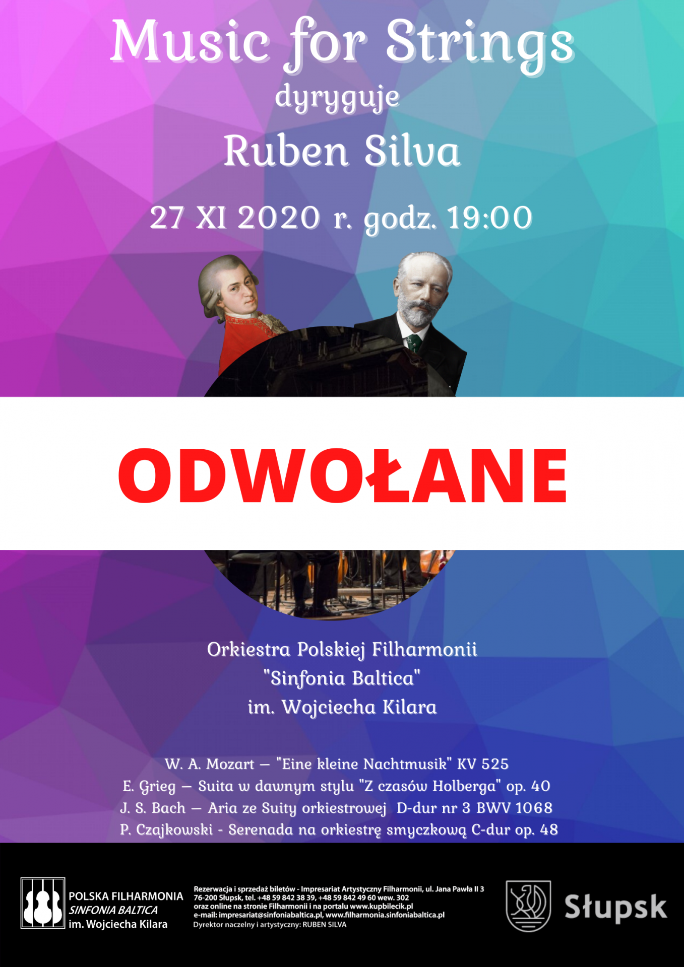 W związku z rozporządzeniem Rady Ministrów z 4 listopada 2020 r. o zawieszeniu działania instytucji kulturalnych odwołane zostają wszystkie koncerty przewidziane na miesiąc listopad. Zwrotów biletów dokonywać można w Kasie Filharmonii codziennie w godzinach 8:00-16:00 lub w razie potrzeby po wcześniejszym kontakcie telefonicznym (tel. (59) 842 38 39).