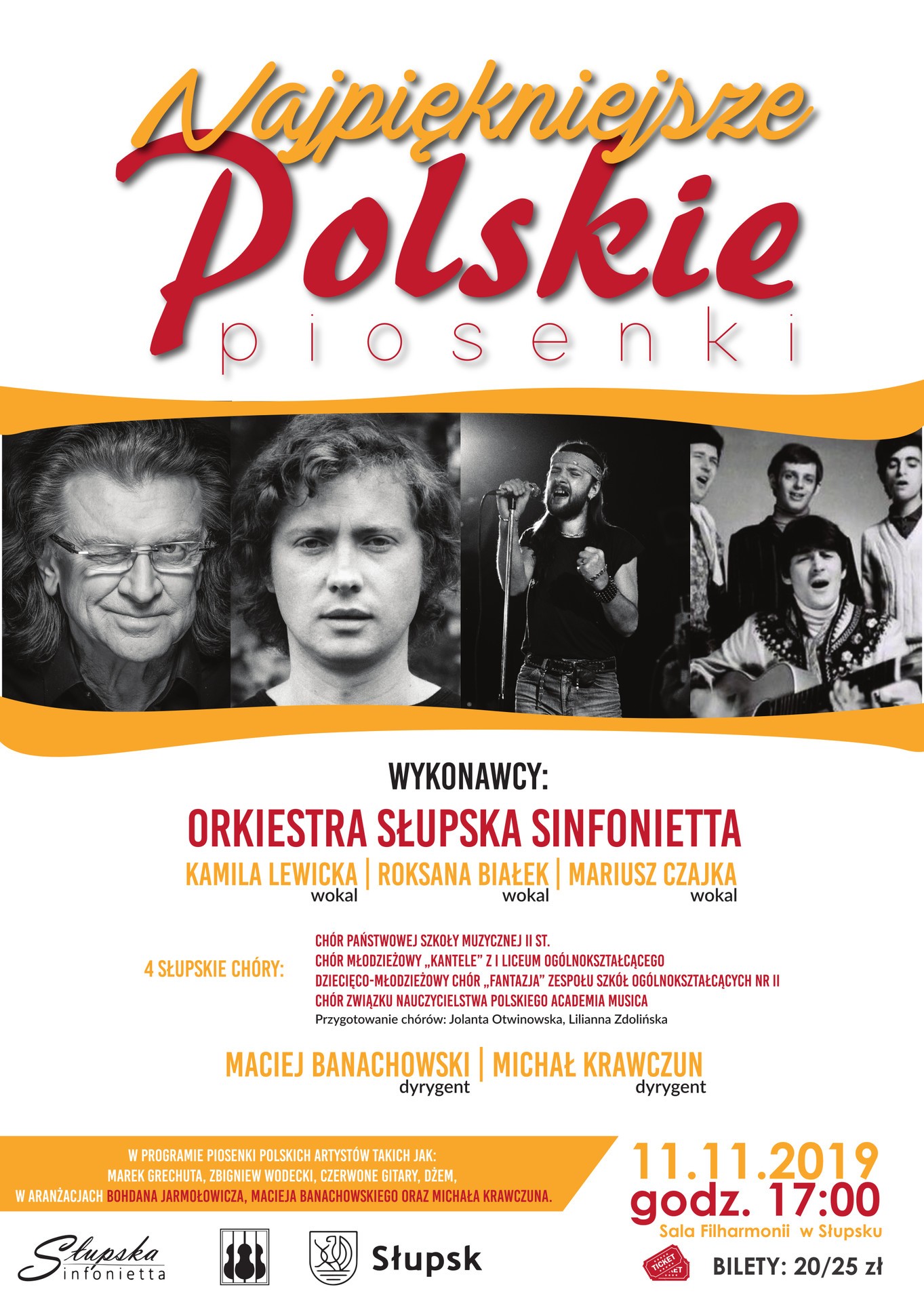 Orkiestra Słupska Sinfonietta zaprasza na koncert, który odbędzie się 11 listopada 2019 r. o godz. 17.00 w sali Filharmonii w Słupsku. Tym razem obchody Dnia Niepodległości uczci w nieco inny sposób. Zamiast pieśni patriotycznych, zagra koncert, pt. „Najpiękniejsze Polskie Piosenki”, podczas którego usłyszmy utwory znanych polskich artystów takich jak Marek Grechuta, Zbigniew Wodecki, Czerwone Gitary, Dżem, w aranżacjach Bohdana Jarmołowicza, Macieja Banachowskiego oraz Michała Krawczuna.