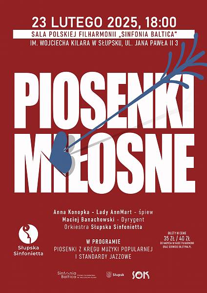 W związku ze zbliżającym się świętem zakochanych, serdecznie zapraszamy Państwa na koncert poświęcony tematyce uczucia miłości. W programie znajdą się polskie i zagraniczne utwory z kręgu muzyki popularnej. Nie zabraknie również standardów jazzowych w aranżacjach na orkiestrę symfoniczną. Solistką koncertu będzie Anna Marta Konopka znana pod pseudonimem Lady AnnMart, która poprowadzi również koncert.