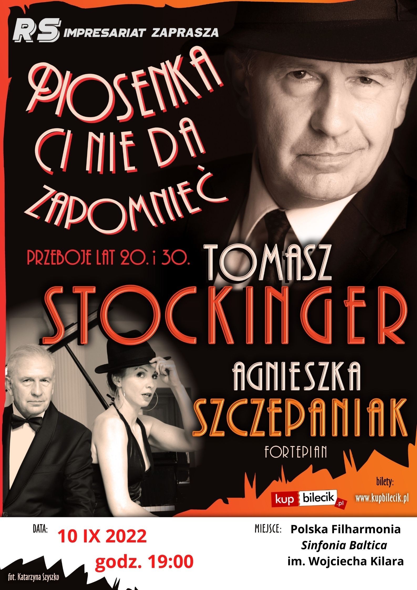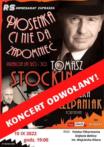 Koncert utrzymany w konwencji recitalu, piosenki przeplatane rozmową z publicznością, żartami charakterystycznymi dla epoki. Lata 20 i 30 minionego wieku to okres twórczości znakomitych autorów, poetów, twórców sceny kabaretowej. Tomasz Stockinger przypomni publiczności prawdziwe "perły" tamtych czasów, jak "Piosenka Ci nie da zapomnieć" , czy " Gdy serce drgnie". Muzykę do fantastycznych tekstów Mariana Hemara czy Jerzego Jurandota pisali m.in Henryk Wars czy Jerzy Petersburski. Wieczór z Tomaszem Stockingerem oraz znakomitą pianistką i kompozytorką Agnieszką Szczepaniak pozwoli Państwu przenieść się w czasy, gdy tekst, muzyka i dobra zabawa były znakiem firmowym epoki. Pozwólcie się porwać w tę ekscytującą podróż...