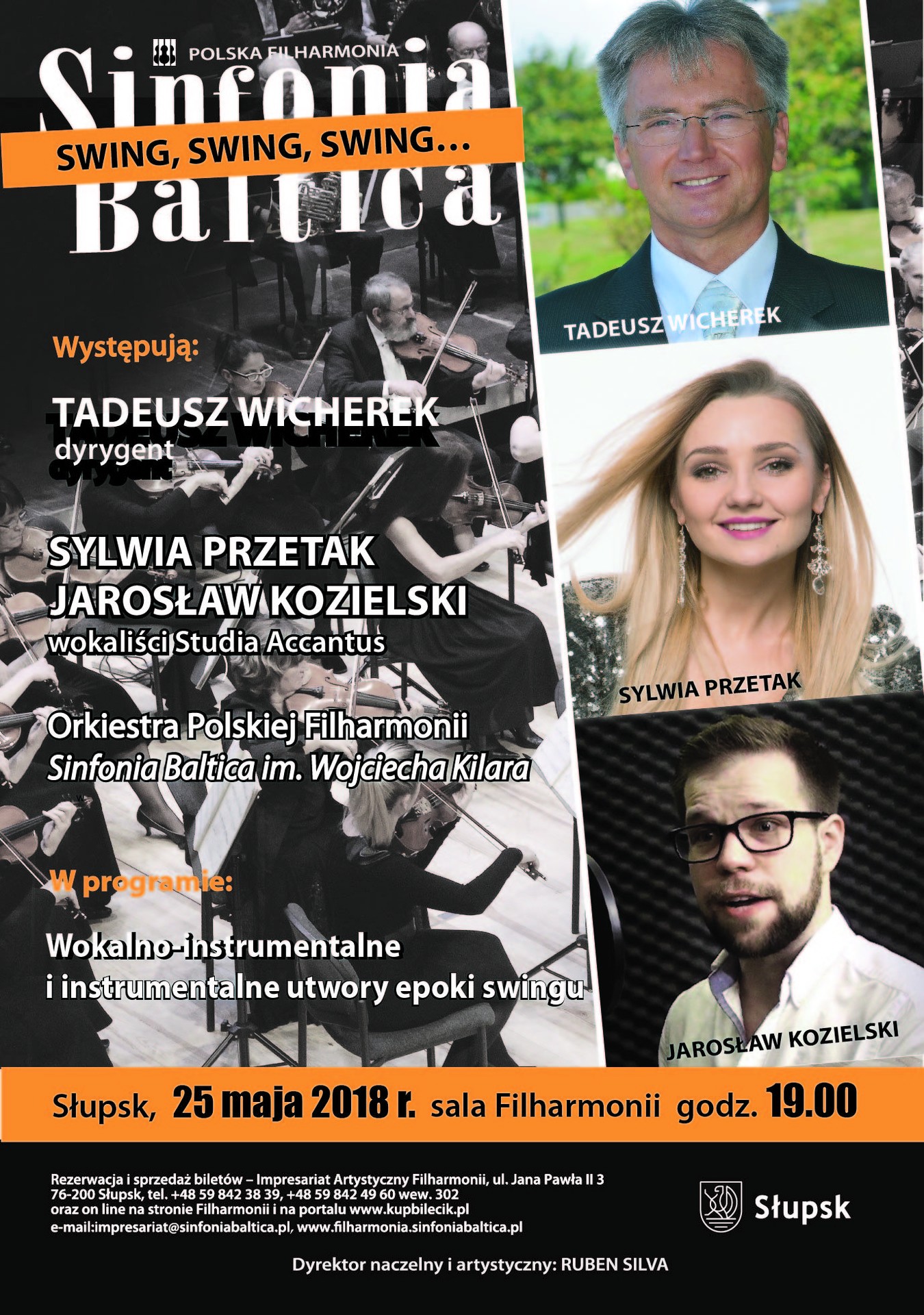 Przeniesiemy się do epoki popularnego w latach 30-tych, 40-tych i 50-tych ubiegłego wieku swingu, stylu, który wziął swój początek w Nowym Orleanie. Usłyszymy najsłynniejsze swingowe utwory z tego okresu, głównie z repertuaru legendy amerykańskiego kina Marilyn Monroe i Franka Sinatry oraz kompozycje instrumentalne Duke’a Ellingtona i Glenna Millera. Młodzi wokaliści z warszawskiego Studia Accantus: Sylwia Przetak i Jarek Kozielski zaprezentują m.in. Night and Day, Somwhere Over the Rainbow, Love and Marriage, Under My Skin, Something Stupid, Diamonds Are Girl's Best Friend. Orkiestrę Polskiej Filharmonii Sinfonia Baltica poprowadzi Tadeusz Wicherek, dyrektor Orkiestry Symfonicznej im. Karola Namysłowskiego w Zamościu.