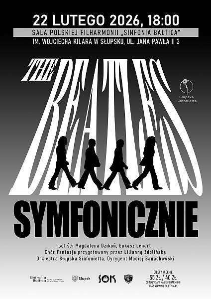 Koncert piosenek jednej z najpopularniejszych grup muzycznych XX wieku w aranżacjach na orkiestrę, chór i solistów. Uniwersalne treści literackie i muzyczne zawarte w kompozycjach Johna Lennon`a i Paula Mc`Cartney`a to doskonała propozycja dla publiczności w każdym wieku. Usłyszymy między innymi takie przeboje jak Yesterday, Let it Be, Hey Jude, czy Yellow Submarine. Nie zabraknie równeż przebojów z wczesnej twórczości zespołu, utrzymanych w stylistyce Rock & Rolla – między innymi All My Loving, Help, czy Can`t Buy Me Love. Solistami będą Magdalena Dzikoń i Łukasz Lenart, a na scenie pojawi się również chór Fantazja z II Liceum Ogólnokształcącego im. Adama Mickiewicza, przygotowany przez Liliannę Zdolińską. Słupską Sinfoniettę poprowadzi Maciej Banachowski.
