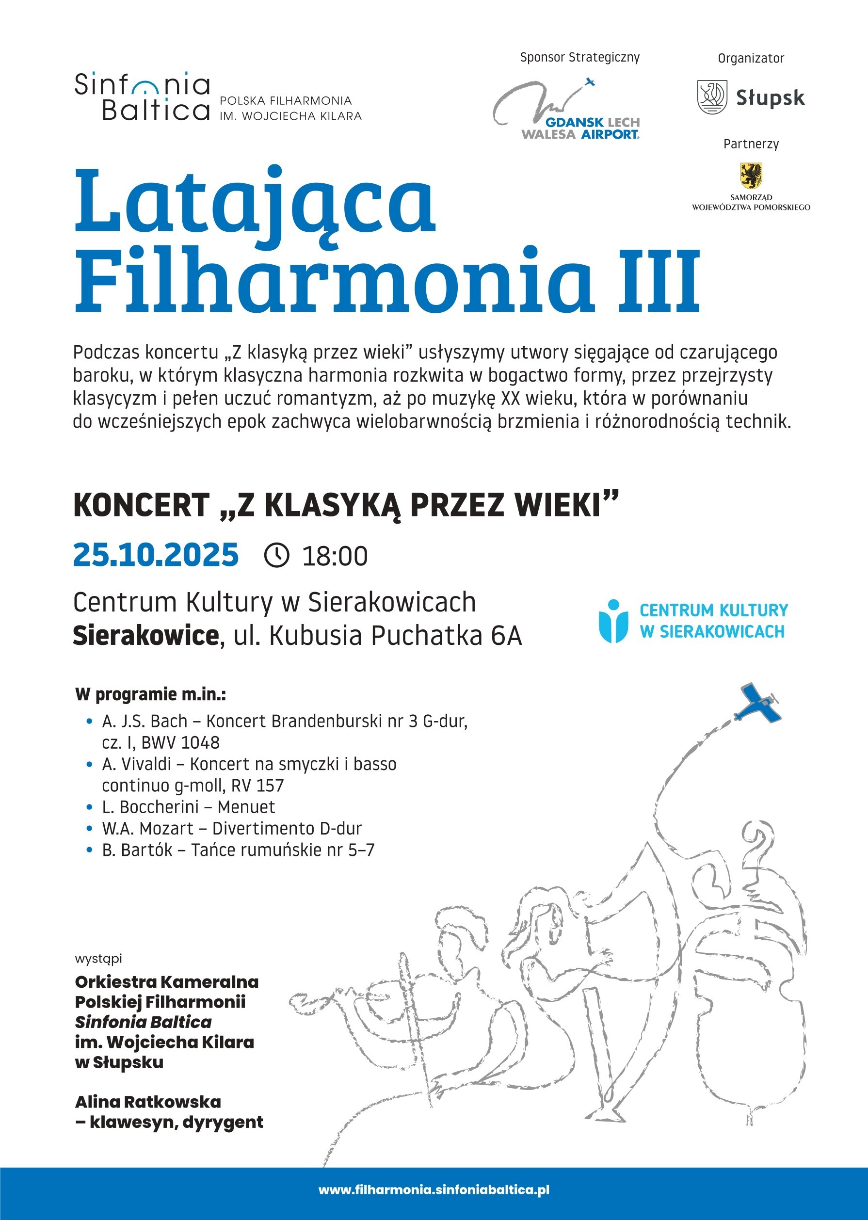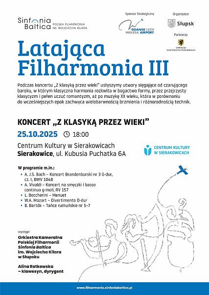 „Latająca Filharmonia” to cykl koncertów, który powstał z potrzeby udostępniania kultury wysokiej w mniejszych miejscowościach województwa pomorskiego, których mieszkańcy nie mają na co dzień możliwości korzystania z oferty filharmonii. W ramach omawianego projektu zmniejszony skład orkiestry Polskiej Filharmonii Sinfonia Baltica im. Wojciecha Kilara pod batutą Dyrektor PFSB prof. Aliny Ratkowskiej wystąpi w czterech pomorskich miastach – Główczycach (13 października 2025 r., godz. 19:00 - GALA STRAUSSOWSKA), Sierakowicach (25 października 2025 r., godz. 18:00 - Z KLASYKĄ PRZEZ WIEKI), Lęborku (26 października 2025 r., godz. 18:00 - BAROKOWA JESIEŃ) oraz Człuchowie (23 listopada 2025 r., godz. 17:00 - GALA STRAUSSOWSKA). W repertuarze znajdują się rozpoznawalne utwory z kanonu muzyki klasycznej, m.in. „Cztery pory roku” op. 8 RV 269 Jesień Antonio Vivaldiego czy Kanon D-dur Johanna Pachelbela, a także walce i polki J. Starussa. Jest to kolejna edycja cyklu, która dotąd cieszyła się dużym zainteresowaniem w ubiegłych latach, zaś koncerty odbywały się przy pełnej publiczności, która z ogromnym entuzjazmem nagradzała orkiestrę brawami na stojąco.